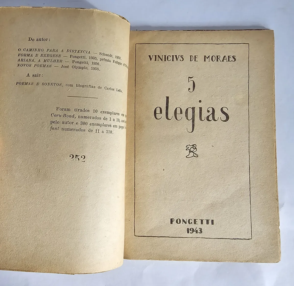 Pongetti, 1943, 1ª edição. Desenho da capa de Joanita Blank e Manuel Bandeira. Edição patrocinada por Manuel Bandeira, Aníbal Machado e Octávio de Faria. Exemplar nº 252 de uma tiragem de 300 exemplares. Brochura. Livro em bom estado de conservação, apenas com as páginas amareladas devido ao tempo e à má qualidade do papel. 42 páginas.