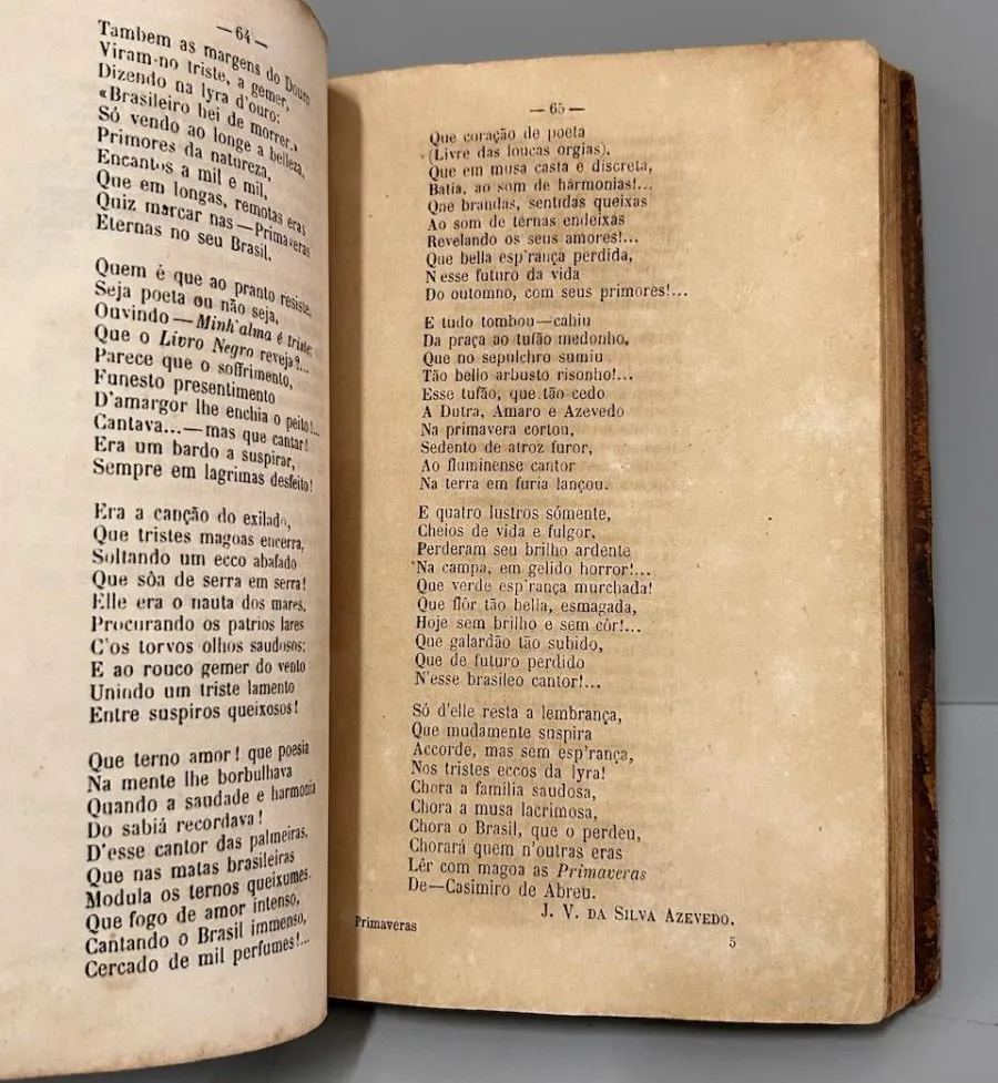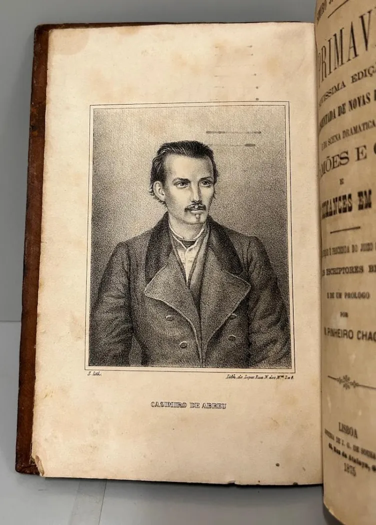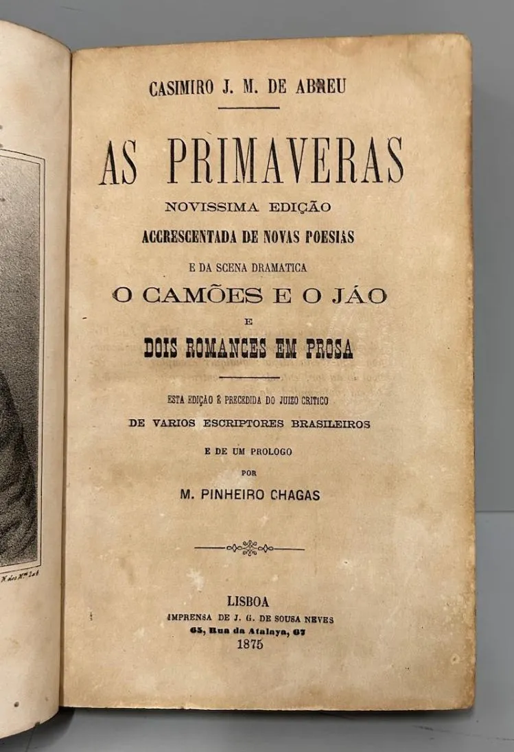 Imprensa de J. G. de Sousa Neves, 1875, 3ª edição, “accrescentada de novas poesias e da scena dramática O Camões e o Jáo e Dois Romances em Prosa.” “Esta edição é precedida do Juízo Crítico de vários escriptores brasileiros e de um prólogo por M. Pinheiro Chagas.” Encadernação antiga em pleno couro. Livro com a encadernação desgastada. Páginas em muito bom estado de conservação. 240 páginas.