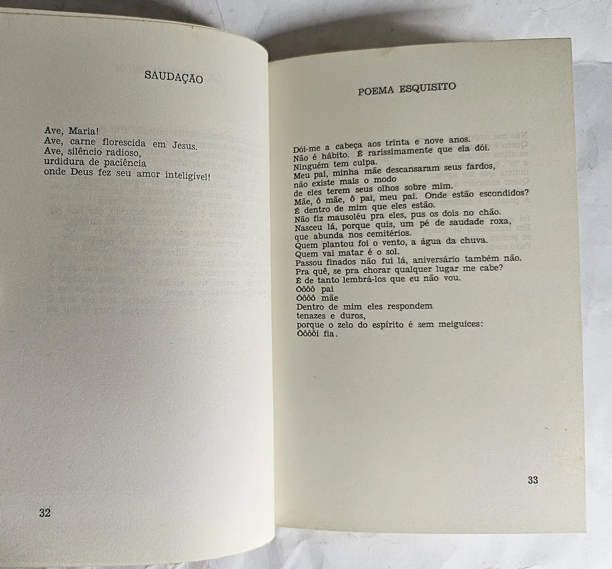 Imago, 1976, 1ª edição. Primeiro livro da autora. Brochura. Livro em muito bom estado de conservação, apenas com uma mancha – marca de etiqueta retirada – na página de rosto. Recorte de revista com reportagem sobre a autora colado no verso da página de rosto. 153 páginas.