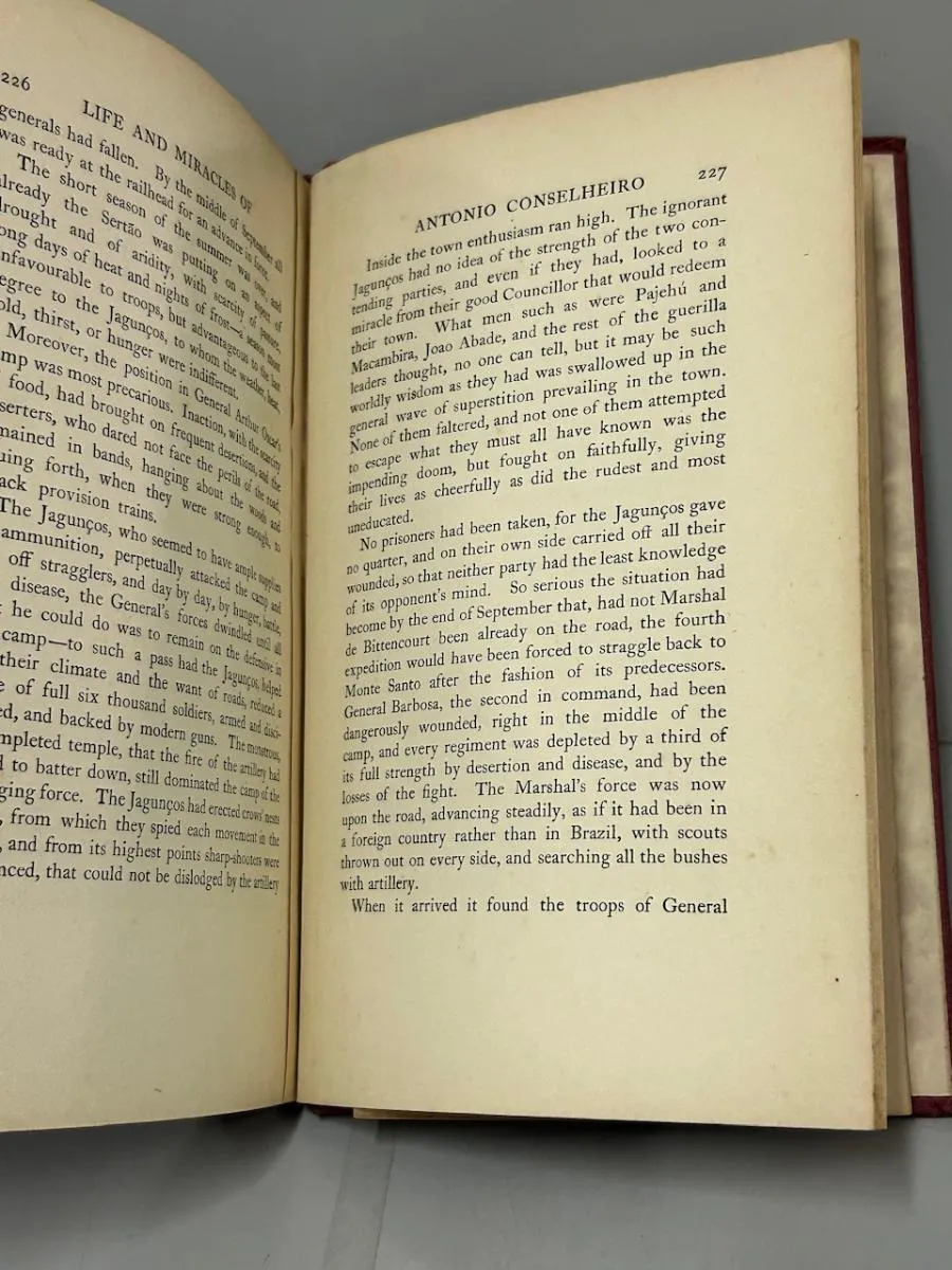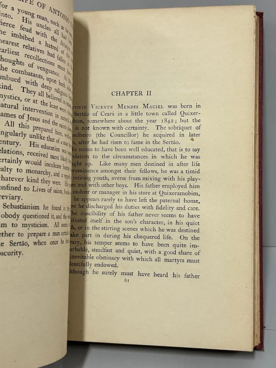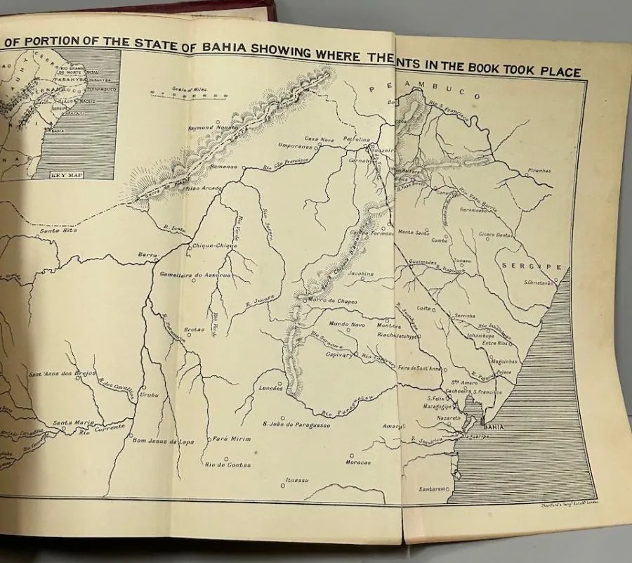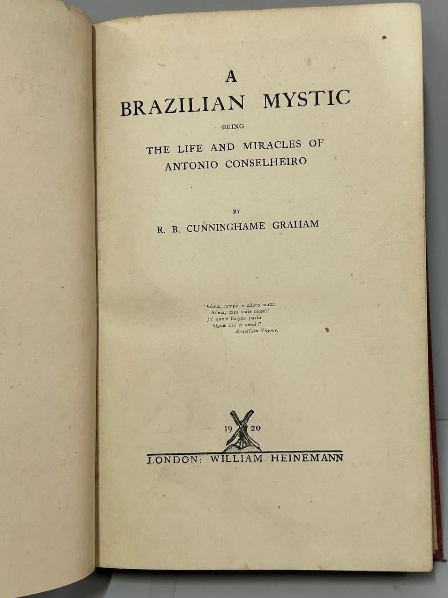William Heinemann, 1920, 1ª edição. “A Brazilian Mystic: Being the Life and Miracles of Antonio Conselheiro.” Encadernação editorial. Encadernação com desgastes. Páginas íntegras e limpas, apenas amareladas pelo tempo. 238 páginas + mapa. Medidas: 16 x 25 cm.