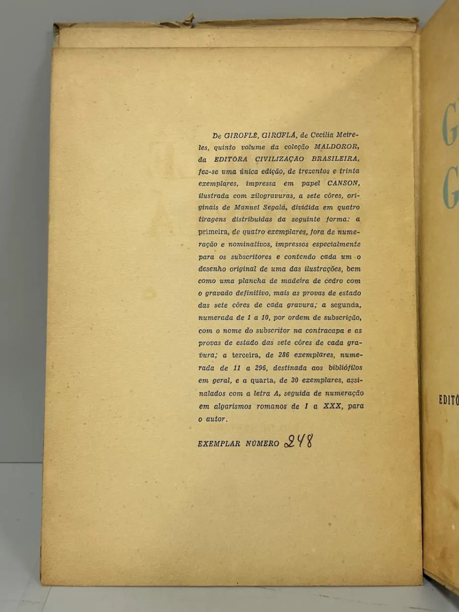 Philobiblion, 1956, 1ª edição. Quinto volume da coleção Maldoror impresso na prensa à mão A VERÔNICA por Manuel Segalá. Edição única de 300 exemplares, ilustrada xilogravuras originais de Manuel Segalá. Exemplar nº 78. Folhas soltas acondicionadas em álbum cartonado original da editora. Livro em bom estado de conservação, apresentando apenas o amarelecimento natural do tempo e alguns desgastes na lombada. Dedicatória do escritor Van Jafa na página de guarda.