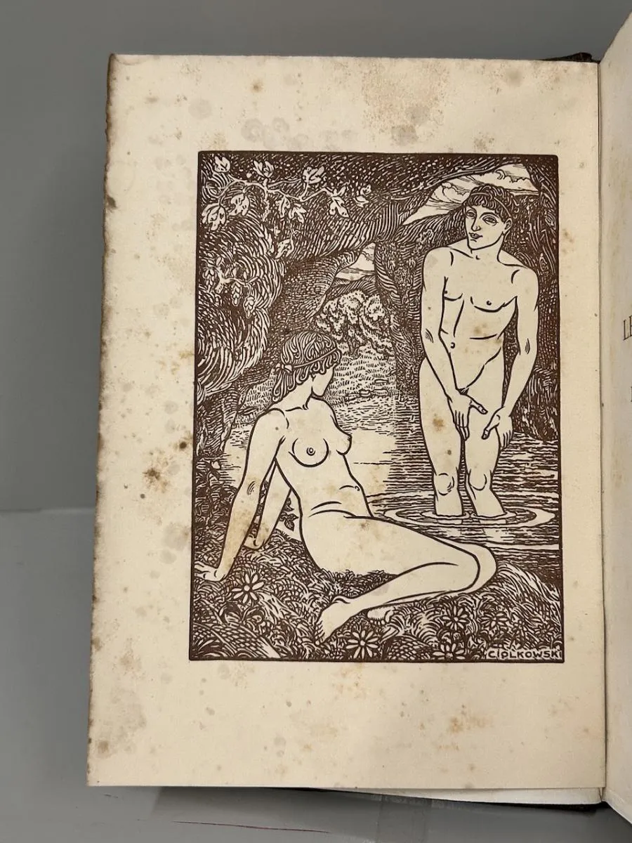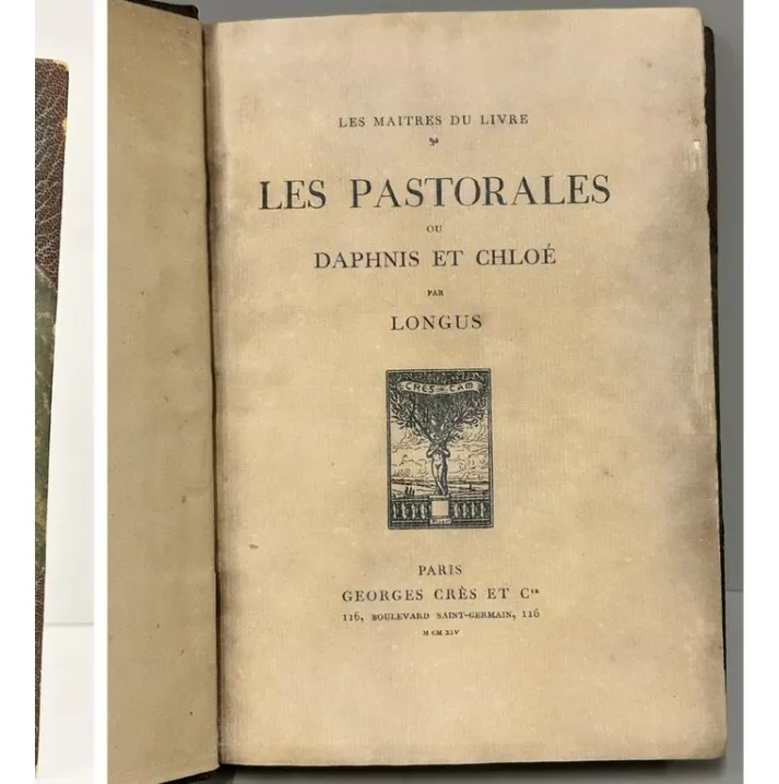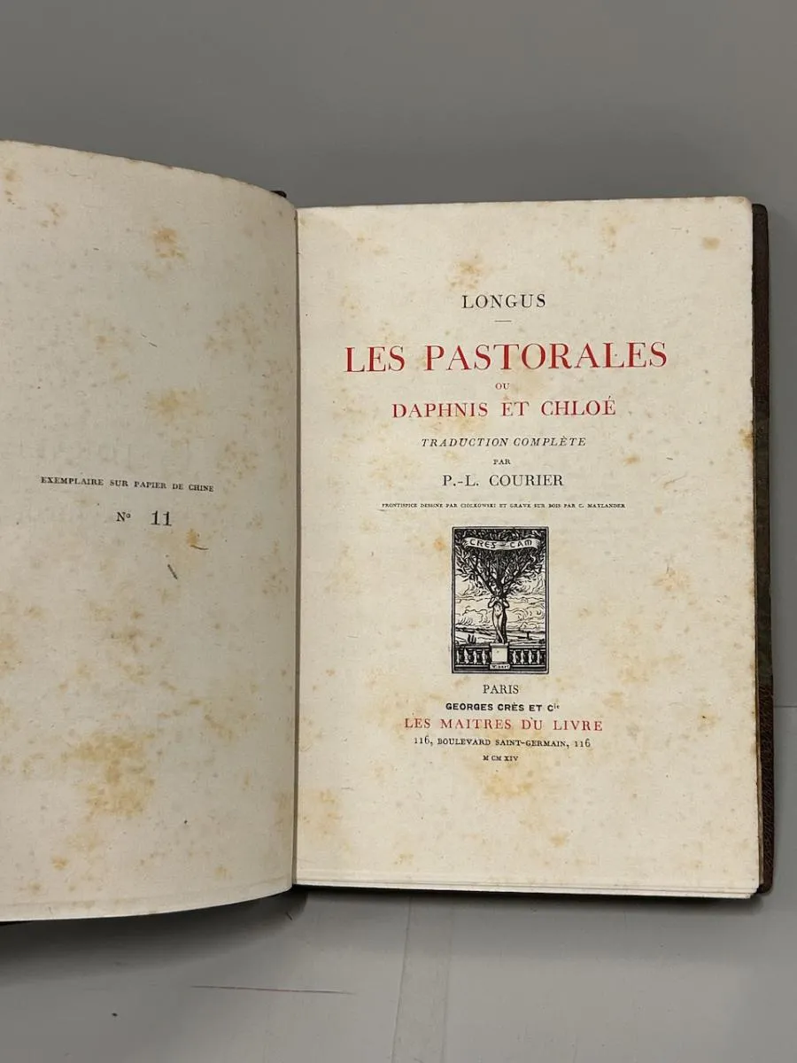 Georges Crès et Cie, 1914. Traduction Complète par P. – L. Courier. Frontispice Dessiné par Ciolkowski et gravé sur par C. Maylander. Exemplar número 11 sobre papel de Chine. Encadernação antiga, lombada e cantos em couro, preservando a capa da brochura. Livro em bom estado de conservação, apresentando apenas o amarecimento natural do tempo. 360 páginas. 13,5 x 19,5 cm.