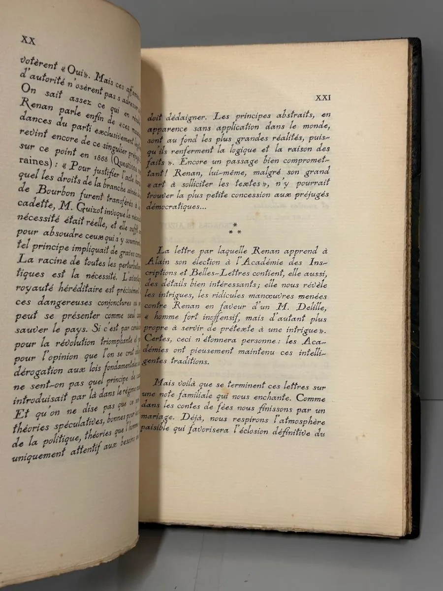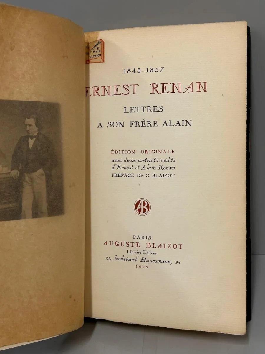 Auguste Blaizot, 1925, 1ª edição. “Édition originale avec deux portraits inédits d’ Ernest et Alain Renan. Préface de G. Blaizot.” Encadernação antiga, lombada e cantos em couro, preservando a capa da brochura. Livro em bom estado de conservação. 135 páginas. 17,5 x 26,5 cm.