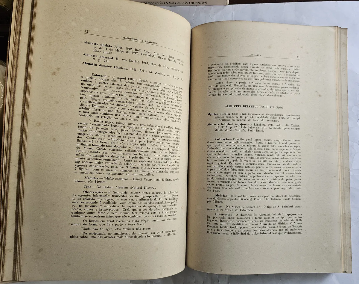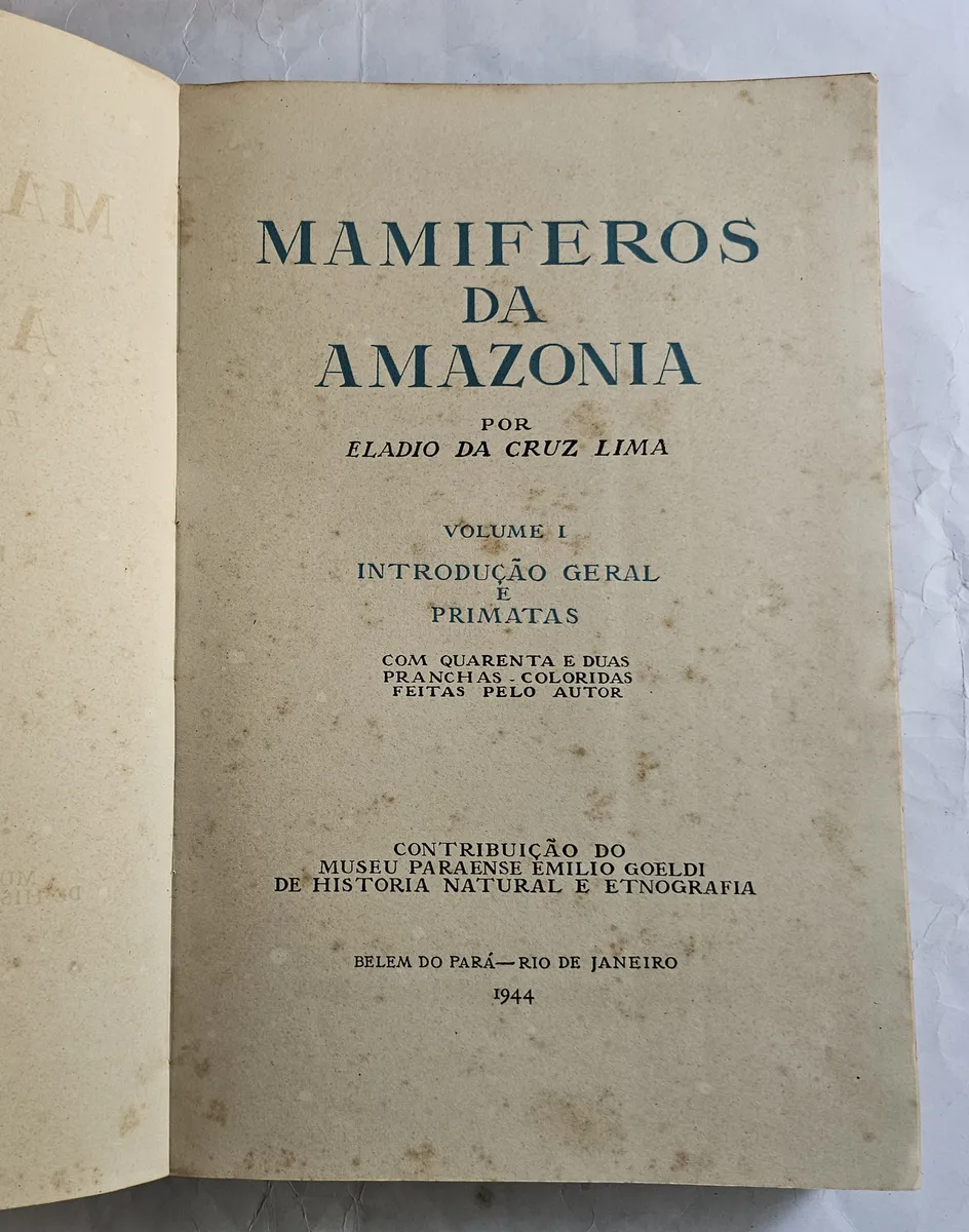 Agir, 1944, 1ª edição. Volume I (só este volume foi publicado): Introdução Geral e Primatas. Ilustrado com 42 pranchas coloridas feitas pelo autor. Contribuição do Museu Paraense Emilio Goeldi de História Natural e Etnografia. Brochura. Livro em muito bom estado de conservação, apresentando apenas o amarelecimento natural do tempo. 272 páginas + 42 pranchas. Medidas: 38 x 25 cm.