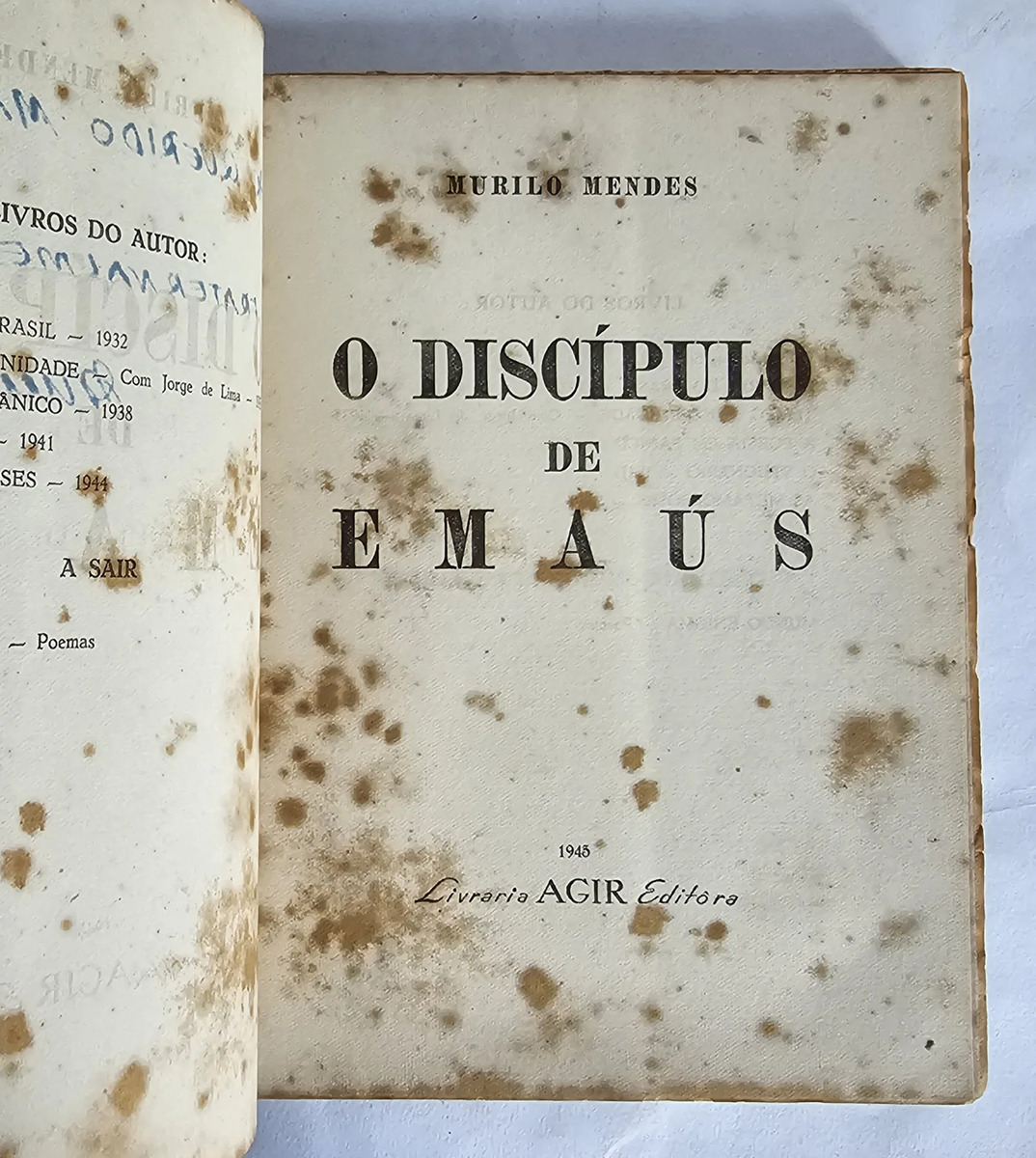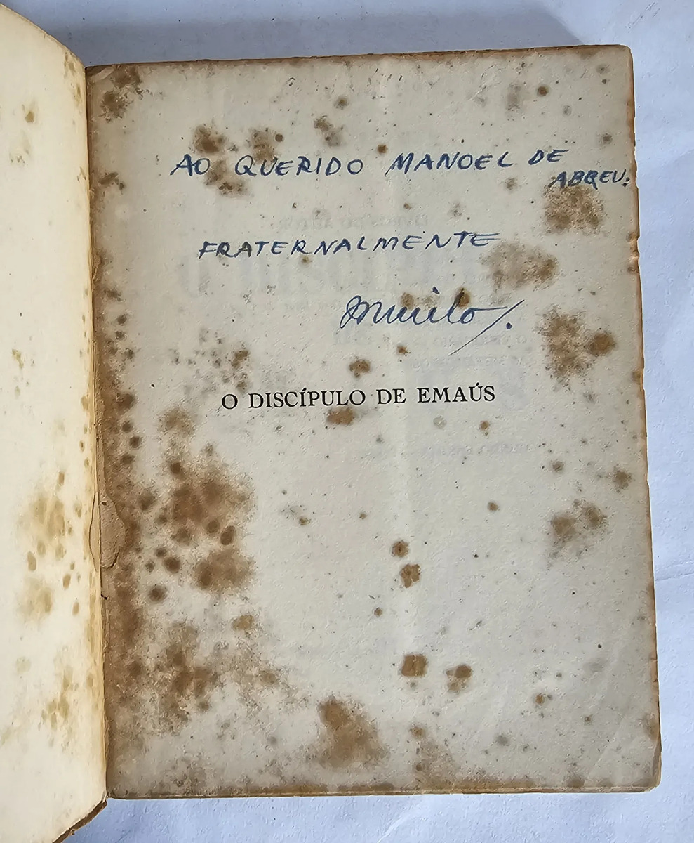 Agir, 1945, 1ª edição, com dedicatória do autor para o poeta Manoel de Abreu. Livro em muito bom estado de conservação, apresentando apenas manchas de acidificação características do papel, mais acentuadas nas primeiras e nas últimas páginas. 138 páginas.