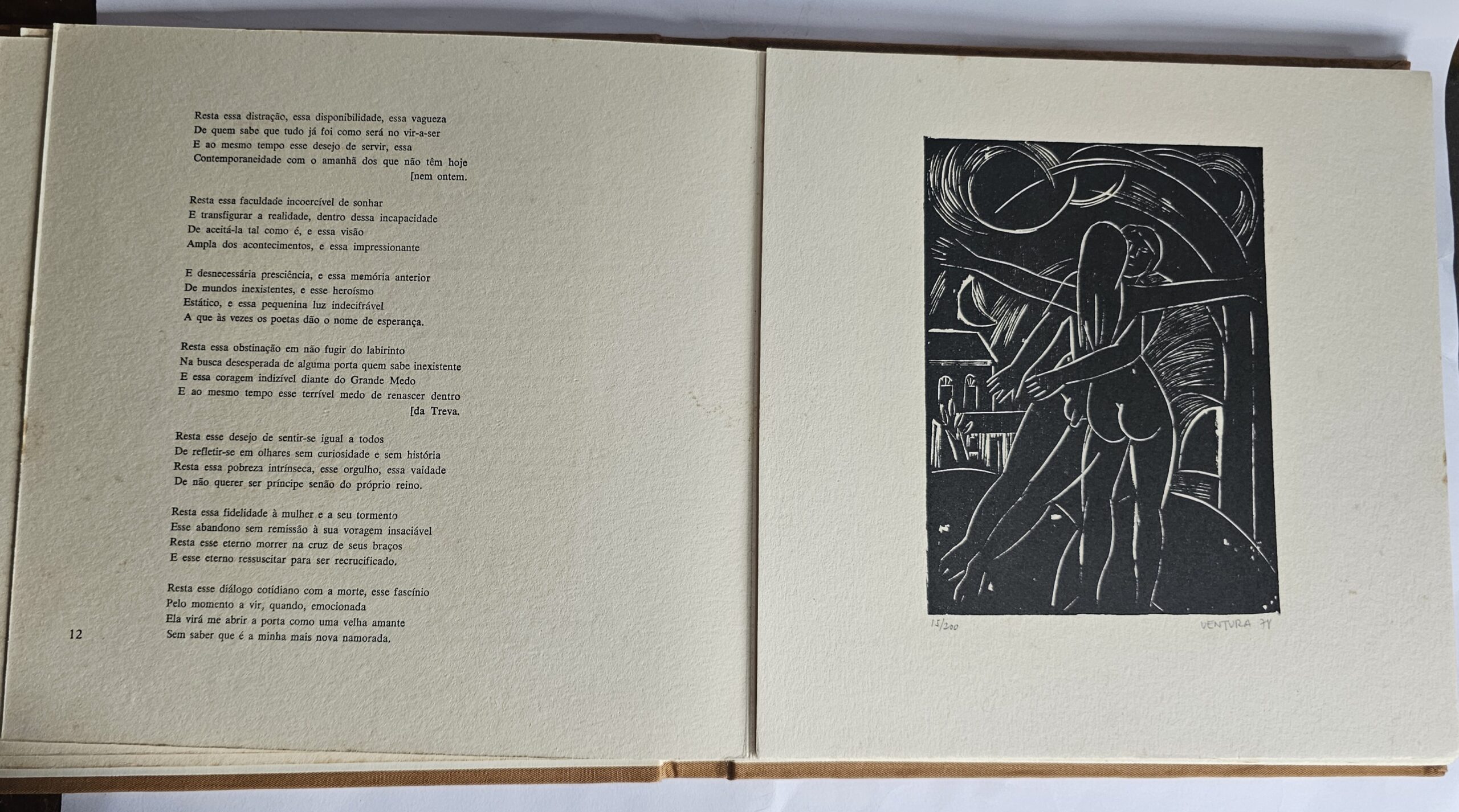 Fontana, 1978, 1ª edição. Poemas de Vinicius de Moraes. Vinhetas e 5 xilogravuras originais de Luiz Ventura, numeradas e assinadas pelo artista. Exemplar número 15 de uma tiragem de 200 exemplares, numerado, sendo que este exemplar não está assinado pelo autor. Livro com algumas manchas de acidificação devido à porosidade do papel. Não acompanha o estojo. 49 páginas. Medidas: 25 x 25 cm.