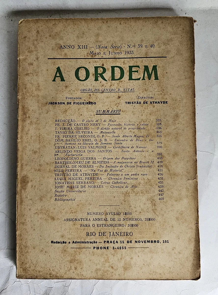 Centro D. Vital, 1933. Números 39 e 40. Brochura. Revista em bom estado de conservação, apresentando apenas o amarelecimento natural do tempo. 324-477 páginas.