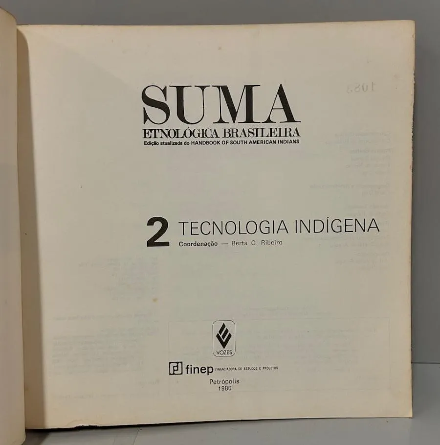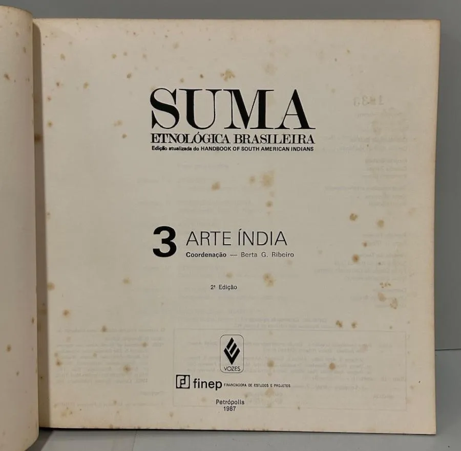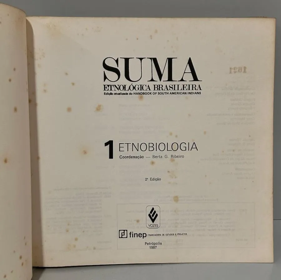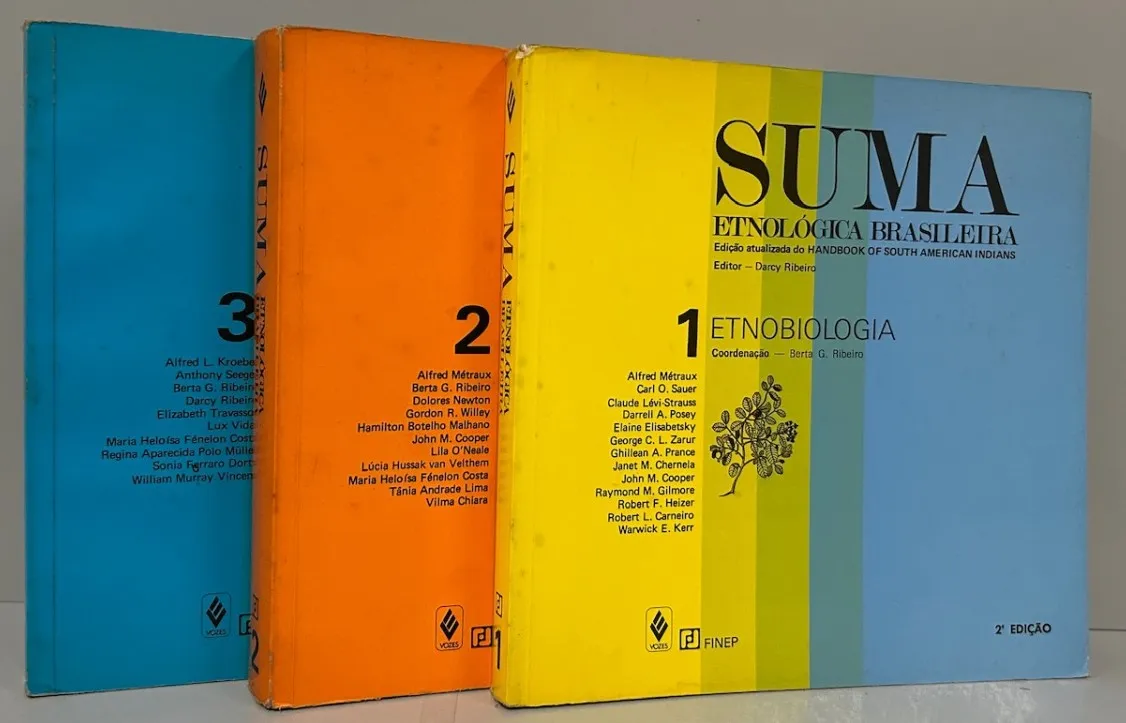 Editora Vozes, 1987. 3 volumes. Editada por Darcy Ribeiro e coordenada por Berta G. Ribeiro, a Suma Etnológica Brasileira, originou-se da tradução de artigos selecionados do “Handbook of South American Indians”, publicado entre 1945 e 1950, organizado por Julian H. Steward, obra essencial para os estudos etnológicos. A publicação do Handbook corresponde a um esforço da corrente da Ecologia Cultural, liderada por Steward, de compreender o papel do ambiente na conformação dos sistemas culturais das sociedades indígenas sul americanas. O plano geral da Suma previa sete volumes, sendo que apenas estes três primeiros chegaram a ser publicados: I. Etnobiologia: 302 pp., II. Tecnologia Indígena: 448 pp., e III. Arte Índia: 300 pp. Brochuras. Revistas em bom estado de conservação, apenas com manchas amareladas naturais do tempo. 21,5 x 21,5 cm.