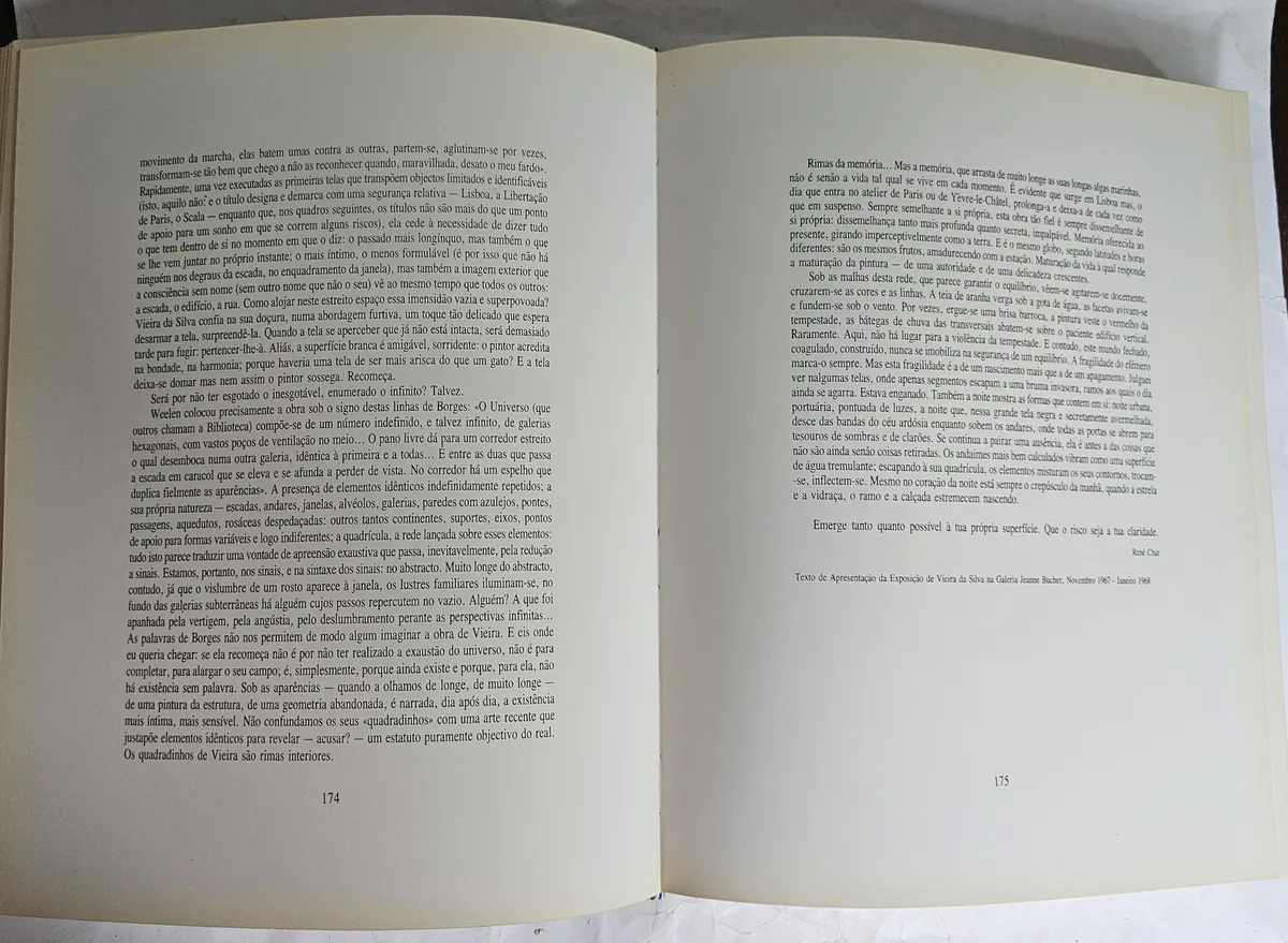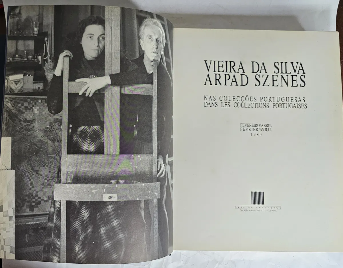 Casa de Serralves, 1989, 1ª edição. Catálogo. Ilustrado com 78 reproduções a cores de trabalhos de Vieira da Silva e 62 de Arpad Szenes, todos de página inteira. Textos críticos de José-Augusto França, Rui Mário Gonçalves, Sophia de Mello Andresen, Mário Cezariny, Eduardo Lourenço, Maria João Fernandes e outros. Poemas de António Ramos Rosa, Sophia de Mello Breyner Andresen, Murilo Mendes, René Char, Alberto de Lacerda e Bernard Noël. Textos biográficos de Mário Cesariny e Agustina Bessa Luís. Edição bilingue em português e francês. Encadernação original da editora com sobrecapa. Livro em bom estado de conservação, apresentando apenas alguns reparos nas margens da sobrecapa e o amarelecimento natural do tempo, mais acentuado nos cortes. Ilustrado. 494 páginas. medidas: 30 x 24 cm.
